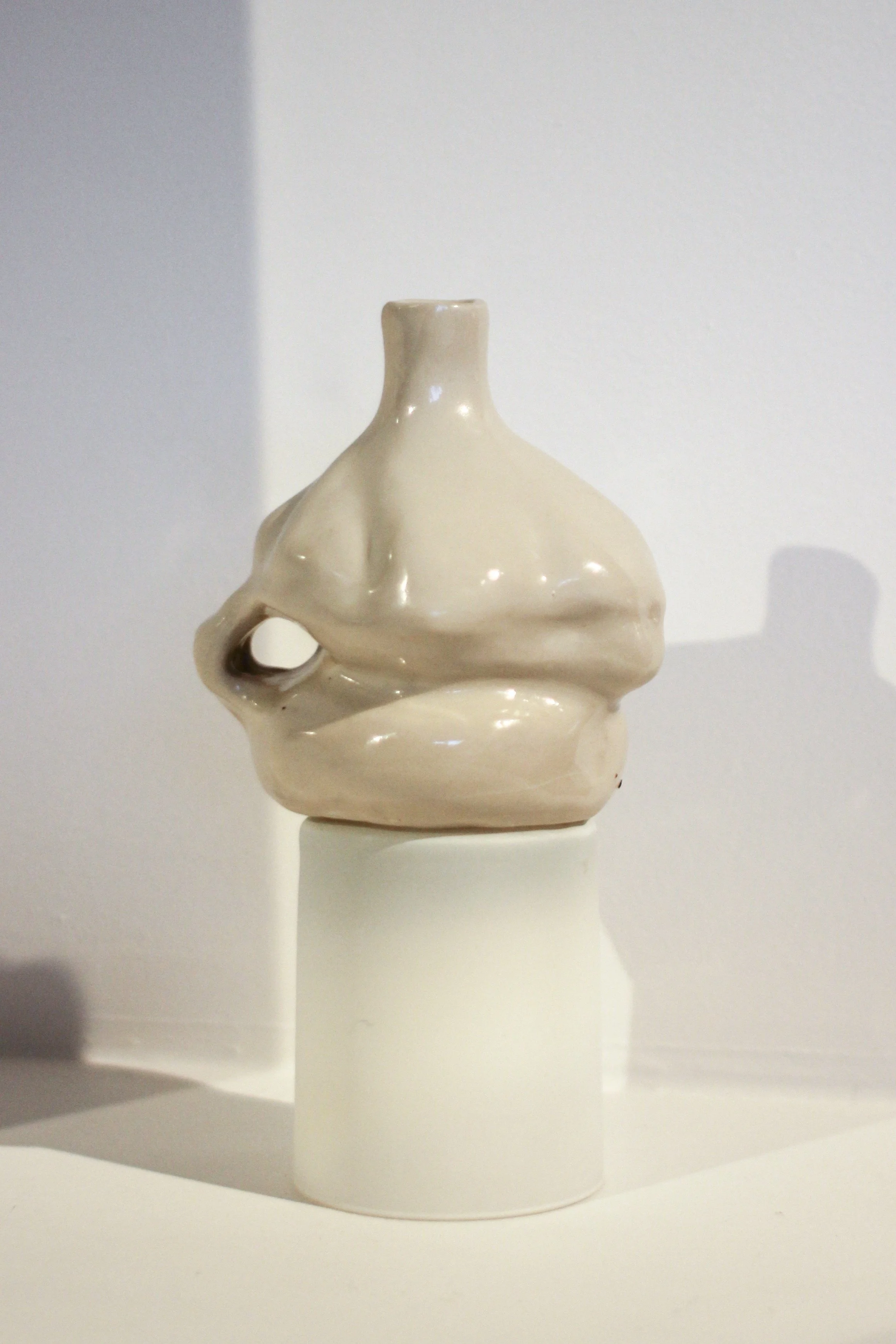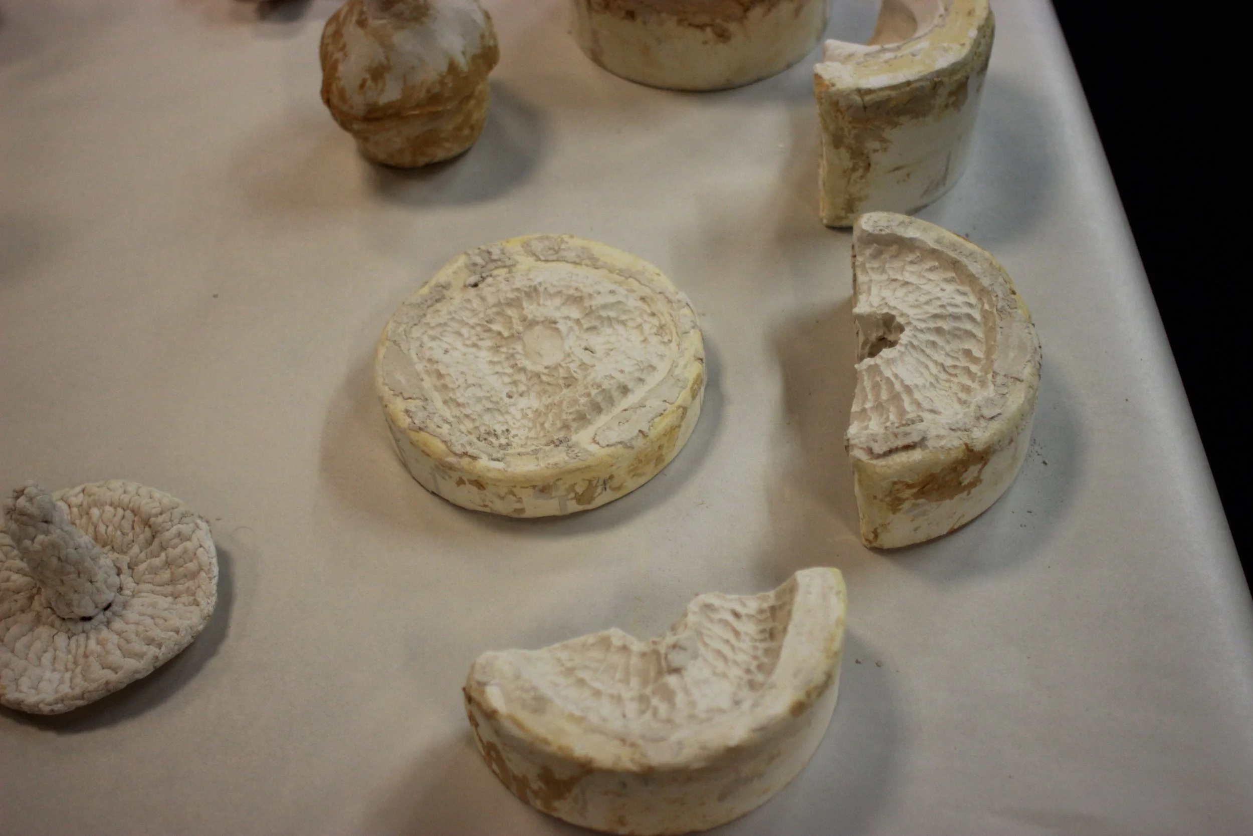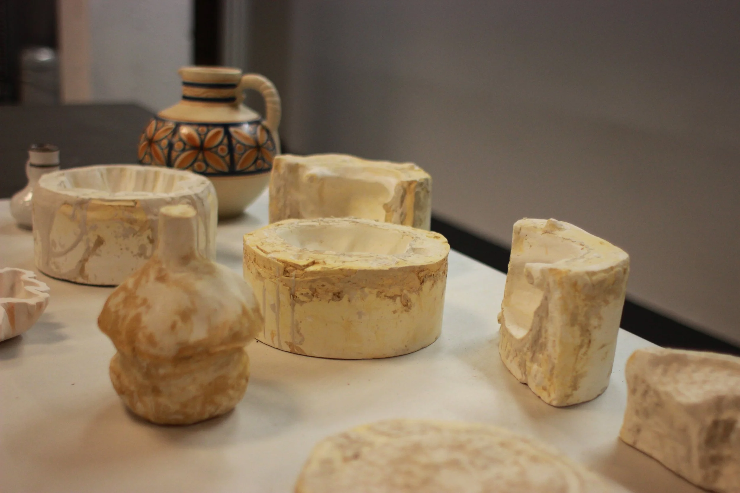 Fjórir vasar og skál eru útkoma tilrauna í keramík og textíl.