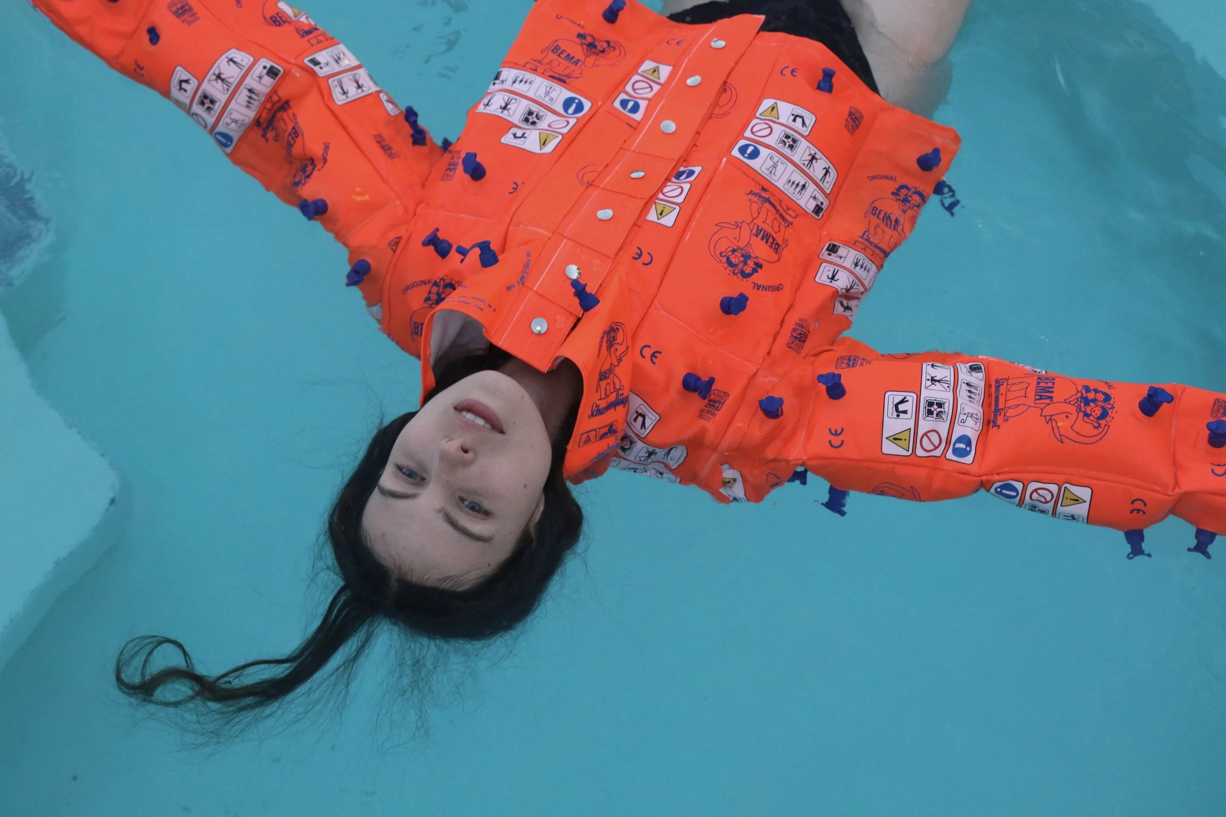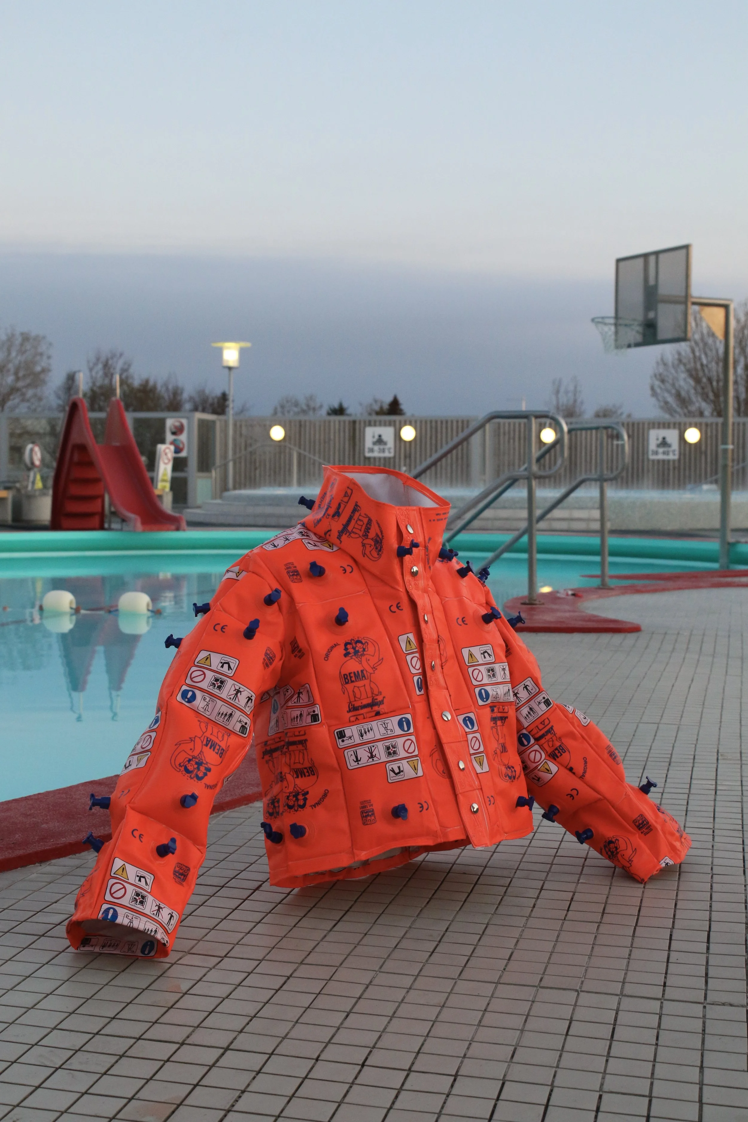 Flíkurnar eru gerðar úr slitnum armkútum sem falla reglulega til í sundlaugum borgarinnar og missa þar með tilgang sinn.